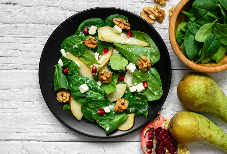 Этот салат – настоящий деликатес. Сладкая груша, хрустящие грецкие орехи и пикантная руккола создают неповторимую гармонию вкусов.