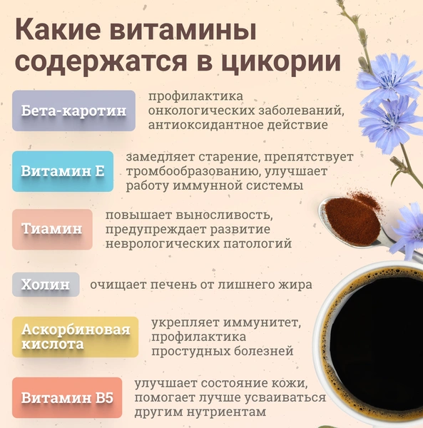 Главная причина, по которой мы полюбили цикорий – это его полезные свойства. В отличие от кофе, он не содержит кофеина, что делает его отличным выбором для людей, чувствительных к этому веществу, а также для тех, кто страдает от проблем с сердцем или нервной системой. Но это далеко не все! Цикорий богат инулином – пребиотиком, который благотворно влияет на микрофлору кишечника. А здоровая микрофлора, как известно, это залог крепкого иммунитета и хорошего пищеварения.