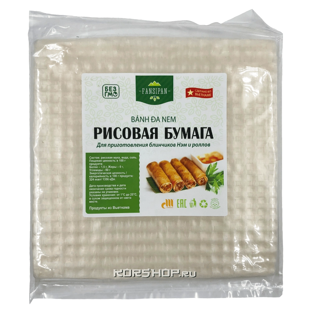 Рисовая бумага‚ известная также как «bánh tráng» во Вьетнаме‚ где она особенно популярна‚ изготавливается из рисовой муки‚ воды и соли. Иногда в состав добавляют тапиоку для придания эластичности. Процесс производства довольно трудоемкий: смесь выливается на ткань‚ натянутую над кипящей водой‚ образуя тонкий блинчик‚ который затем сушится на солнце. В результате получается полупрозрачный лист‚ который перед употреблением необходимо смочить в воде.