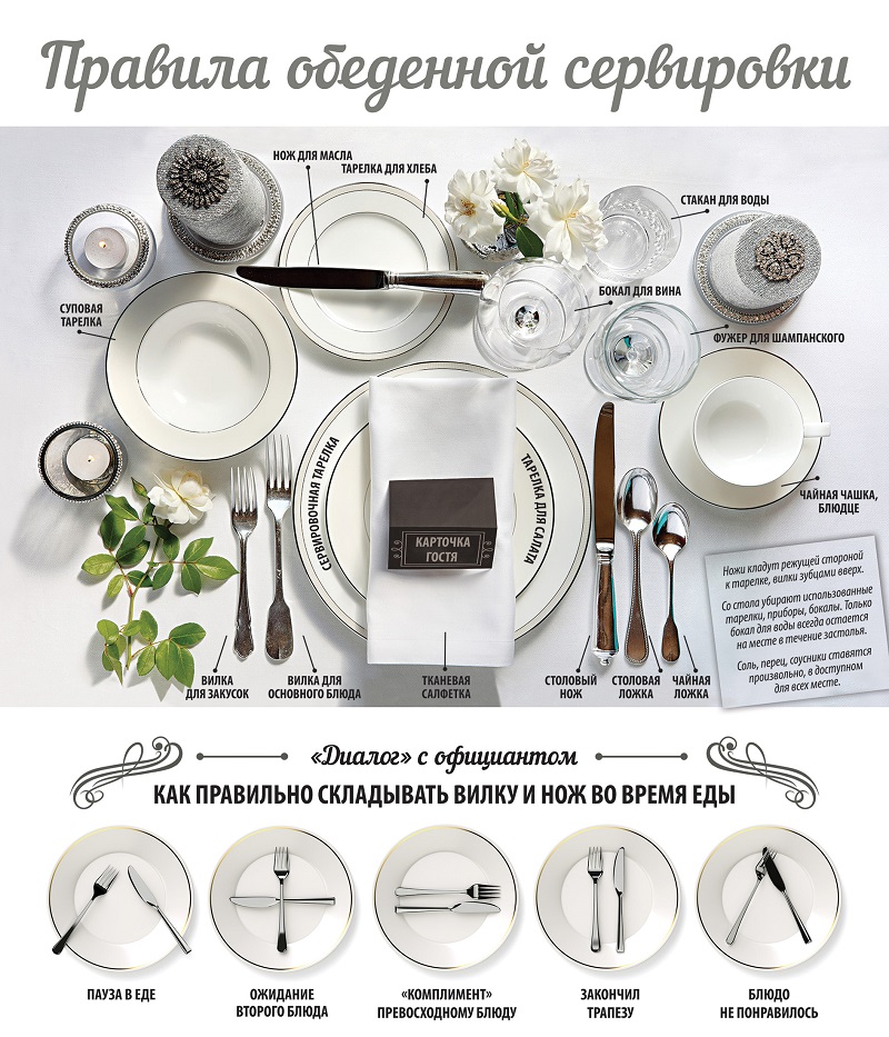 Использование приборов – это целая наука, но мы не будем углубляться в сложные правила этикета. Достаточно запомнить несколько основных моментов. Начинаем использовать приборы, которые лежат дальше всего от тарелки, и постепенно продвигаемся к центру. Если на столе несколько вилок или ножей, то это означает, что подадут несколько блюд, для каждого из которых предназначен свой прибор. После использования прибор не кладем обратно на стол, а оставляем на тарелке.