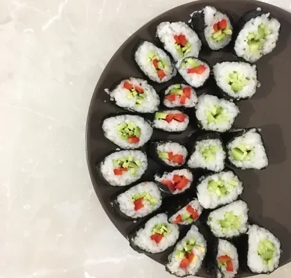 - Ингредиенты: Рис для суши, листы нори, веганский сливочный сыр, авокадо, огурец․